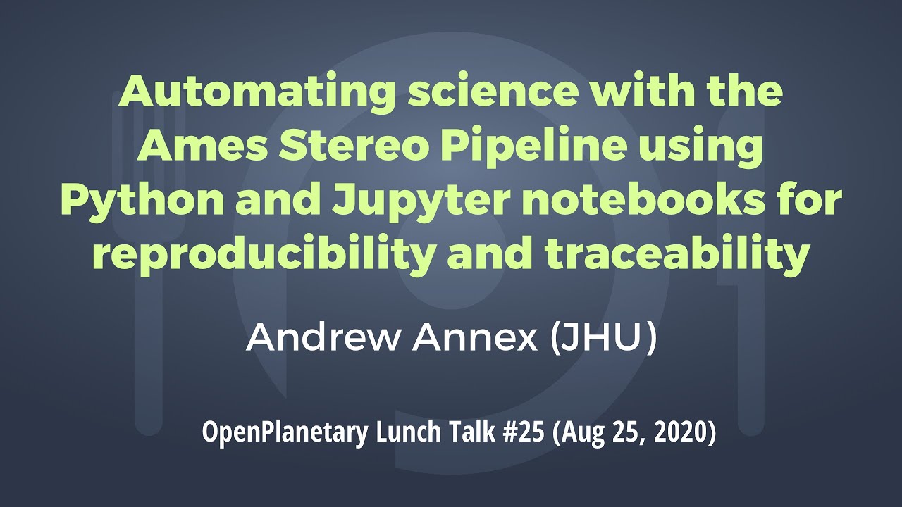 Andrew Annex @andrew.annex (JHU) talks about “the ASAP Stereo project, automating science with the Ames Stereo Pipeline using Python and Jupyter notebooks for reproducibility and traceability”.